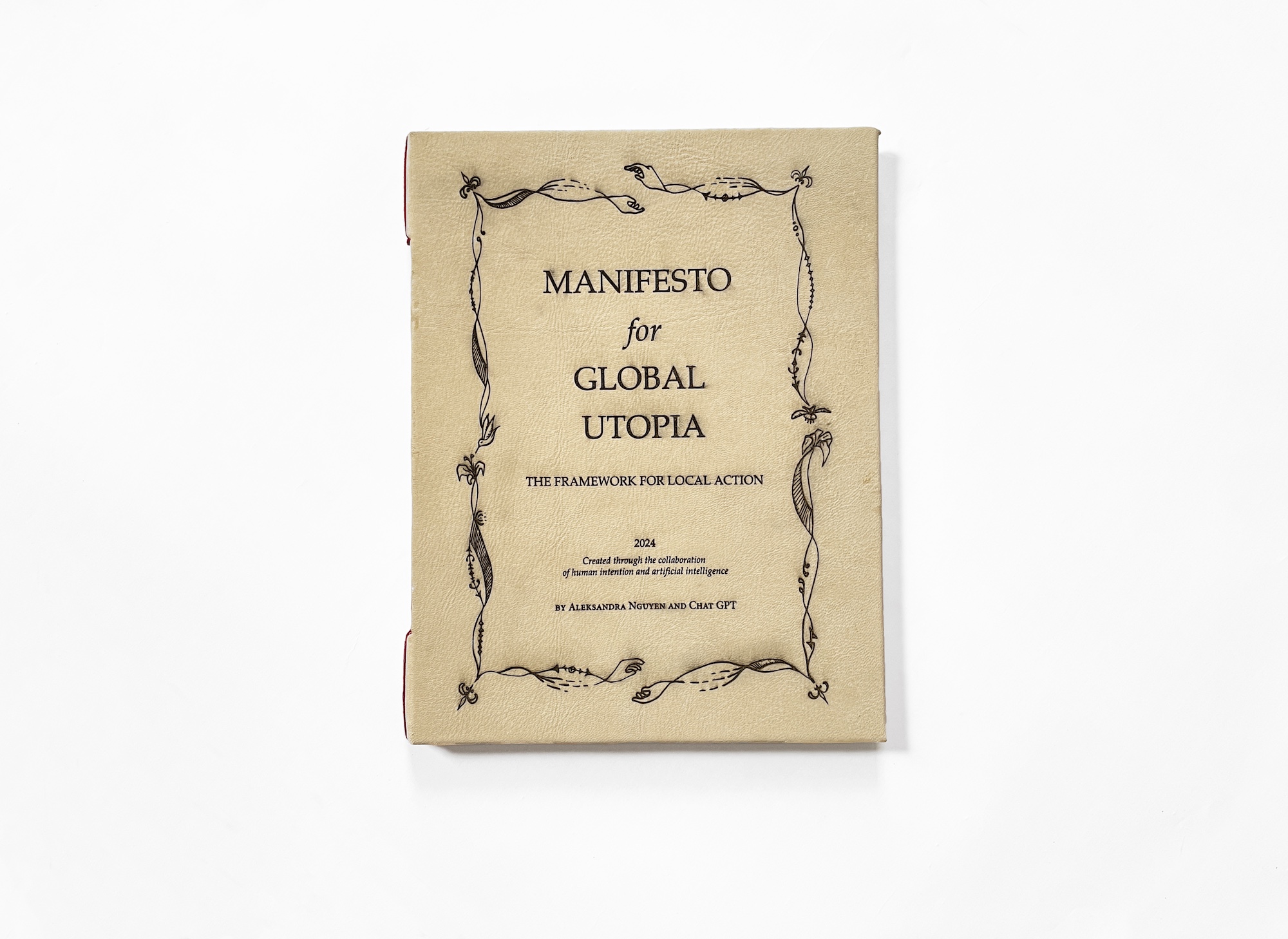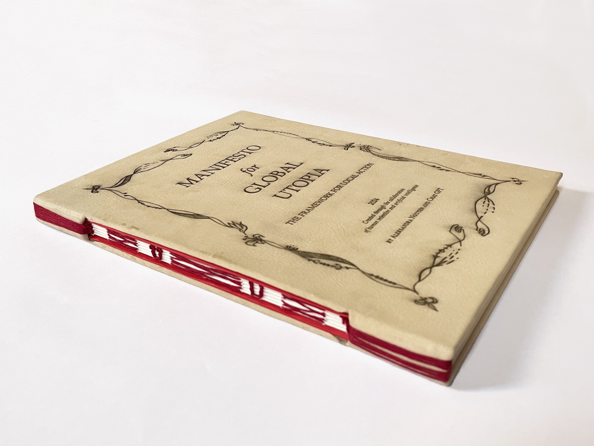 What does ChatGPT think Utopia is like? The manifesto outlines the structures of utopian life and how humanity can reach it. The text is written by ChatGPT, and edited and prompted by me. I wrote the last chapter to provide context and biases of ChatGPT. Illustrations and calligraphy by me. Hand-bound with laser-engraved leather.